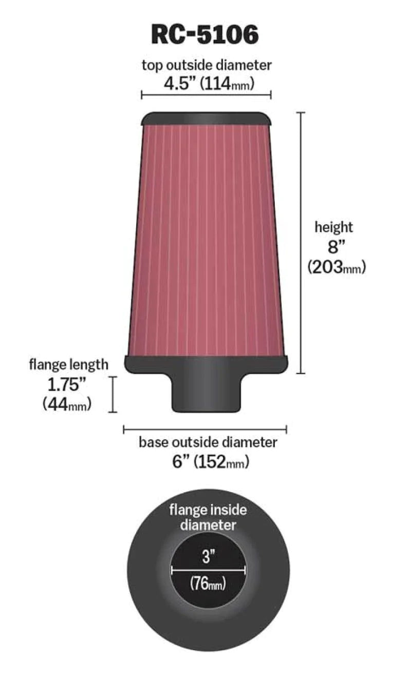 K&N Universal ChromeRound Tapered Air Filter 3in Flange ID / 6in Base OD / 4.5in Top OD / 8in Height. Filtre à air universel en Chrome. Universal Clamp-On Air Filter. Filtro Universal De Cromo. Universal Chrome Filter. Universal Clamp-On A. Universal Filter. Air Filter