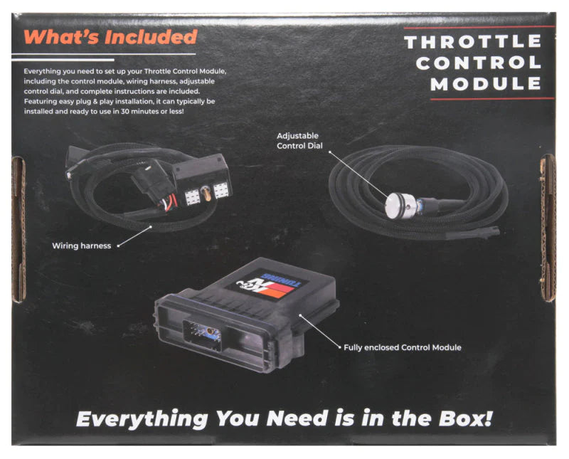 The K&N Throttle Control Module is designed to improve throttle response and acceleration, and increases pedal sensitivity without modifying factory ECU settings. The system processes input data from the gas pedal, and modifies the signal before sending it to the ECU for an adjustable level of sensitivity, creating an increase in throttle responsiveness that will make your car feel like a whole new machine. The Throttle Control Module can typically be installed in less than 30 minutes with no software required, and is adjustable on-the-go, helping you fine-tune the sensitivity of your throttle response. The kit includes the module, wiring harness, adjustable knob, hardware, and detailed instructions, and is covered under K&N's 90-Day Limited Warranty. How It Works -The Throttle Control Module processes input data from the gas pedal, and modifies the signal before sending it to the ECU for an adjustable level of sensitivity, creating an increase in throttle responsiveness. Wire harness -The wire harness connects the Throttle Control Module's electronic control unit to the throttle pedal on the vehicle, allowing a direct connection between your gas pedal and throttle body. The plugs and connectors are designed to attach directly to your vehicle's stock components for easy plug-and-play installation. Control dial -The stylish aluminum control dial installs into the cab of your vehicle to give you direct control over your Throttle Control Module, allowing you to adjust how much or how little the throttle signal is adjusted. Not legal for sale or use on any pollution controlled motor vehicle in California.